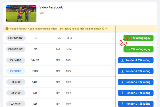 - Với các video chất lượng HD trở lên, hệ thống cần gộp video và âm thanh thành một file duy nhất. Hãy nhấn Render & Tải xuống và đợi vài giây để FDown.vn tự động xử lý.