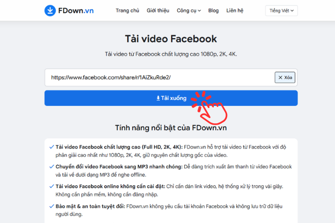 Mở trình duyệt và truy cập FDown.vn. Dán liên kết video vừa sao chép vào ô nhập liệu trên trang chủ, sau đó nhấn nút Tải xuống để hệ thống bắt đầu xử lý.